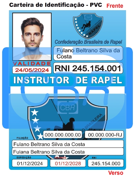 Carteira de Identificação e Credencial - Após aprovação do aluno na prova avaliativa da CBR, será emitido pela CBR a Carteira de Identificação e Credencial do Instrutor de Rapel Confederado; E o número da RNI do Instrutor ficará disponível para consulta no Site da CBR. OBS: Credencial/Carteira estão inclusos no valor do curso.